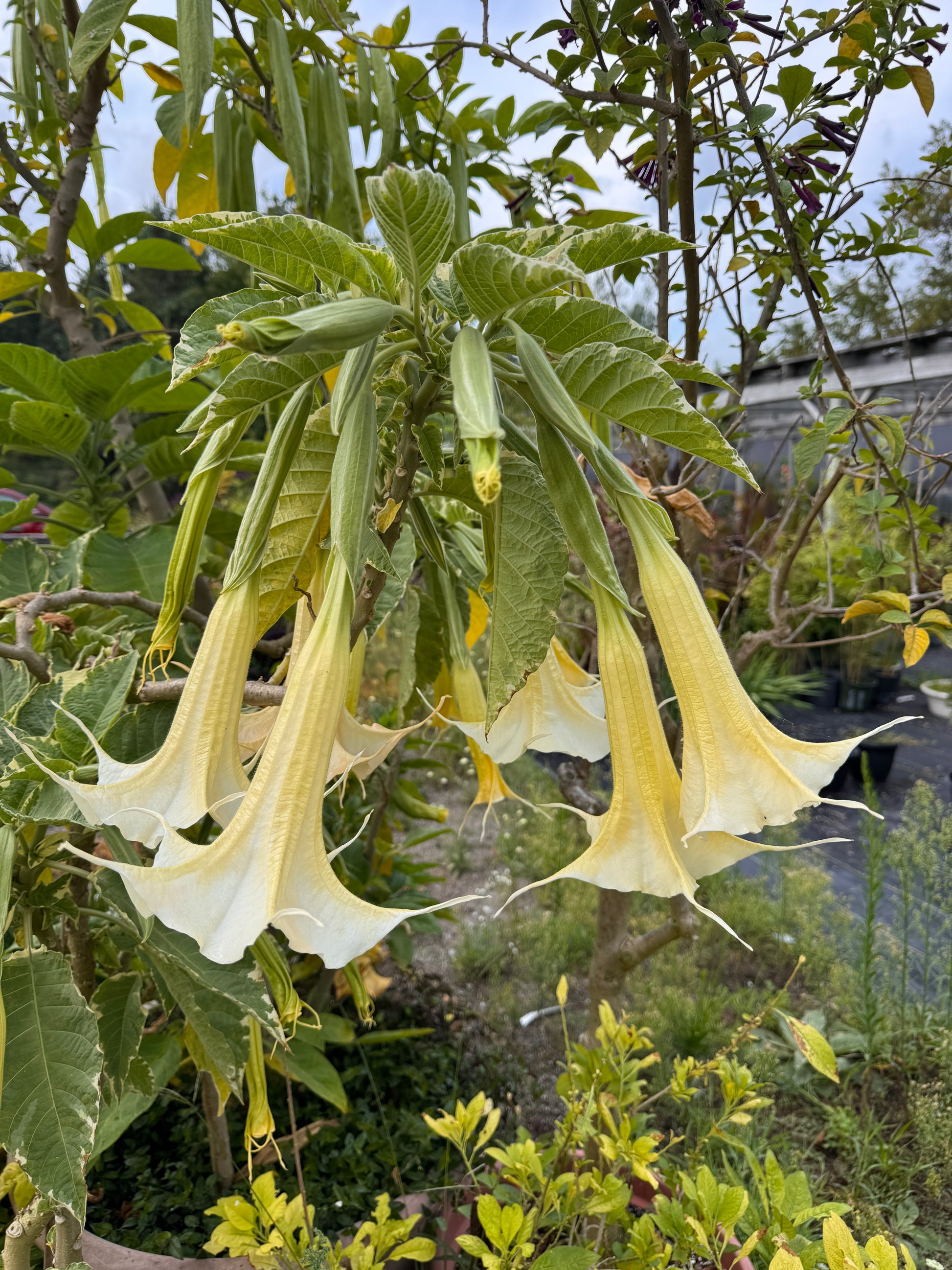 As evening approaches, the blooms release the classic, sweet Brugmansia fragrance — rich and intoxicating, transforming patios and garden spaces into a sensory retreat. The warm pastel colouring pairs beautifully with the richly variegated foliage.
